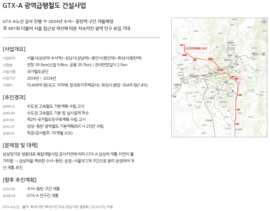 - GTX-A노선(수서~동탄) 2024년 상반기 개통 예정으로 서울 및 수도권 접근성 개선