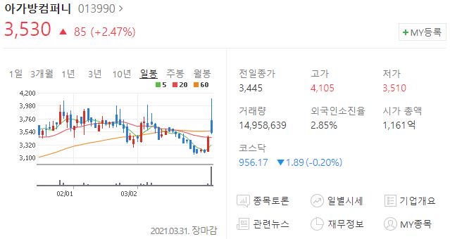 아가방컴퍼니 주가 3,530원(+2.47%)