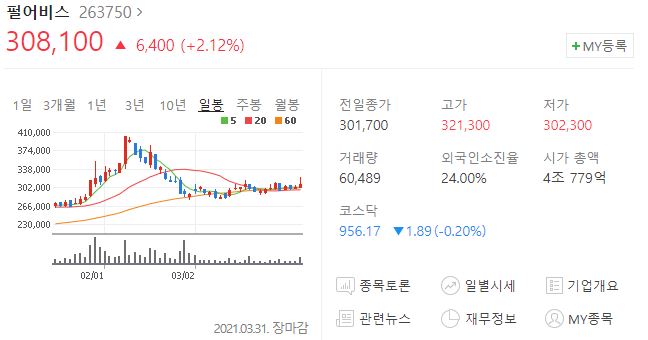 펄어비스(263750)가 액면분할 소식에 장 초반 강세를 보이고 있다. 31일 마켓포인트에 따르면 이날 오전 9시 23분 기준 펄어비스는 전거래일 대비 1만6300원(5.40%) 오른 31만8000원에 거래 중이다. 전날