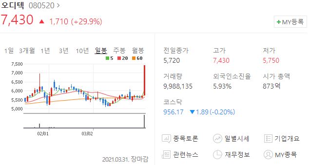 FAB에 들어가는 부품 생산을 삼성전자에 납품하는 오디텍 회사 삼성전자가 테슬라에 LED 헤드램프를 처음 공급한다는 소식에 상한가