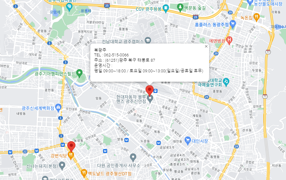 주소 광주광역시 북구 태봉로 87 종근당빌딩 1층(지번:신안동 2-8)