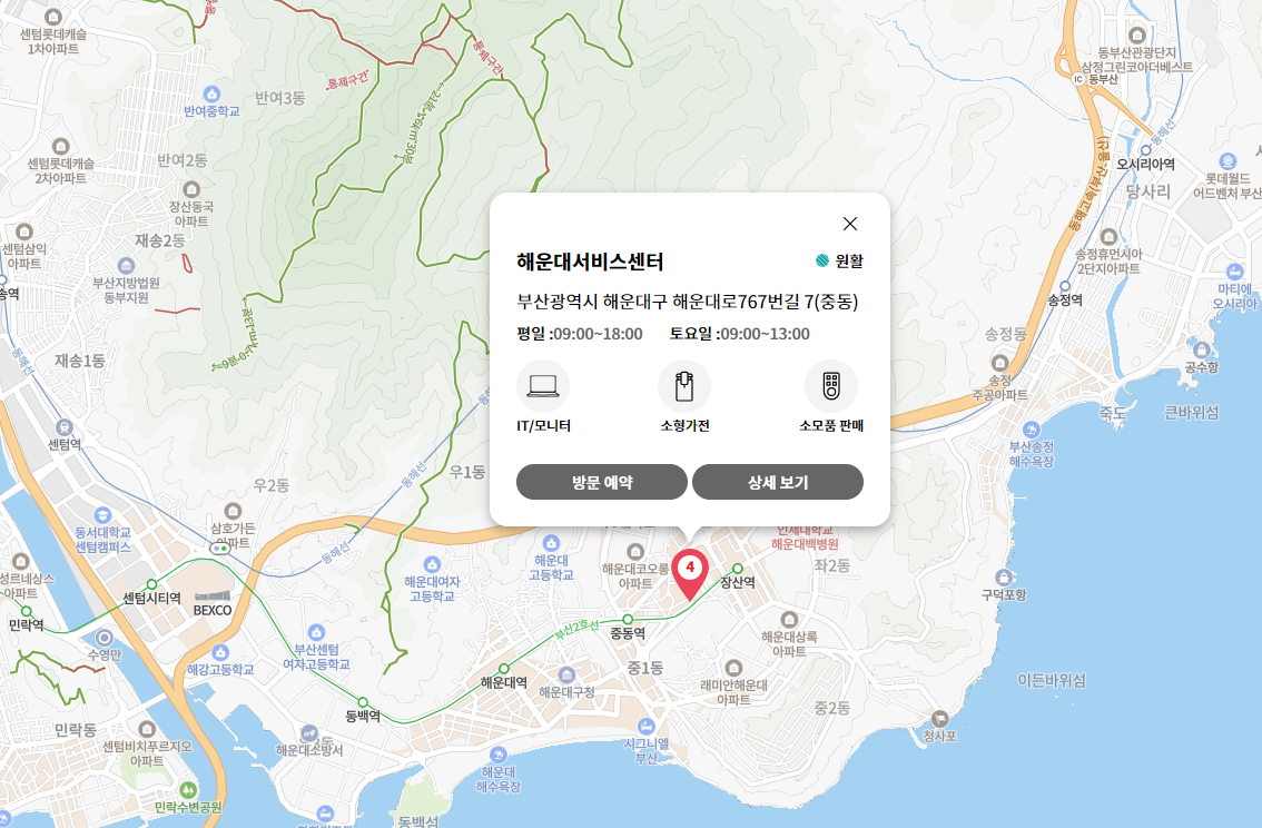 주소 부산광역시 해운대구 해운대로767번길 7 LG BEST SHOP 4층(지번:중동 284-3)