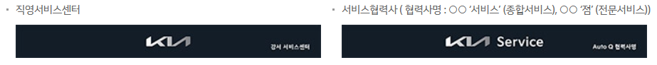 | 종합 서비스 - 기아(주) 자동차의 보증 및 일반(엔진/미션), 차체수리(판금, 도장) 정비 가능 인력 및 장비 보유 오토큐 전문 서비스 - 기아(주) 자동차의 보증 및 일반(엔진/미션 작업 제외) 정비 기능 인력 및 장비 보유 오토큐 마스터오토큐(MQ) - 기아 오토큐 중 차별화된 시설 및 기술력을 보유한 상위 최우수 오토큐 차체 수리우수사업장 - 종합서비스 중 차체수리 우수사업장 인증 오토큐(매뉴얼 준수, 차별화 장비, 우수인력 보유) |