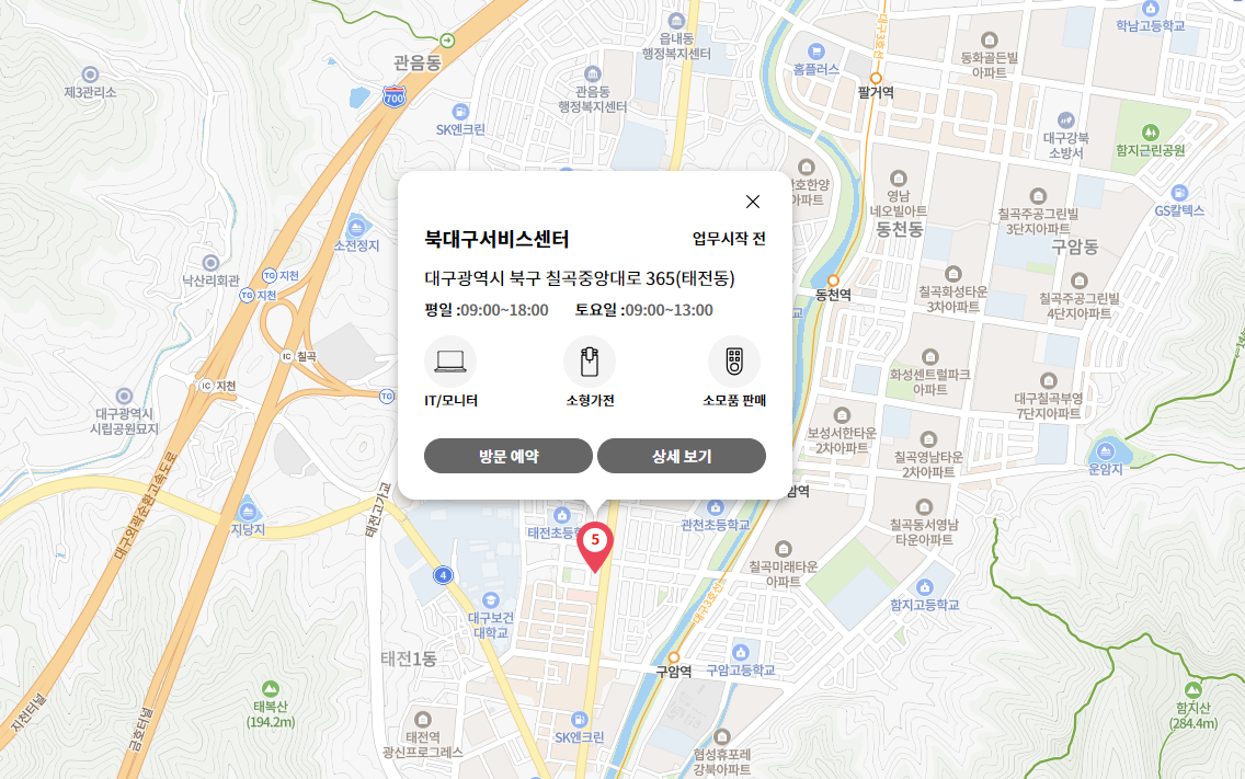 주소 대구광역시 북구 칠곡중앙대로 365 LG BEST SHOP 2층(지번:태전동 1228)