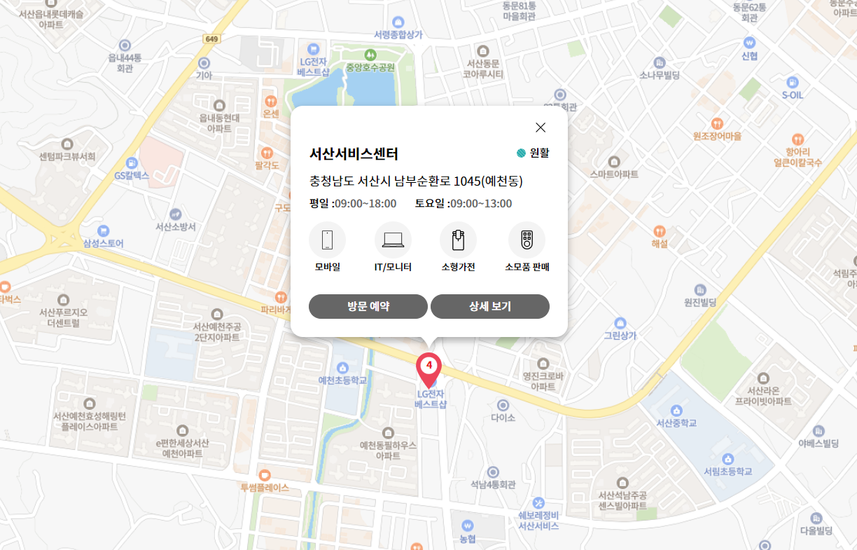 주소 충청남도 서산시 남부순환로 1045 LG 베스트샵 서산예천점 3층(지번:예천동 20-2)