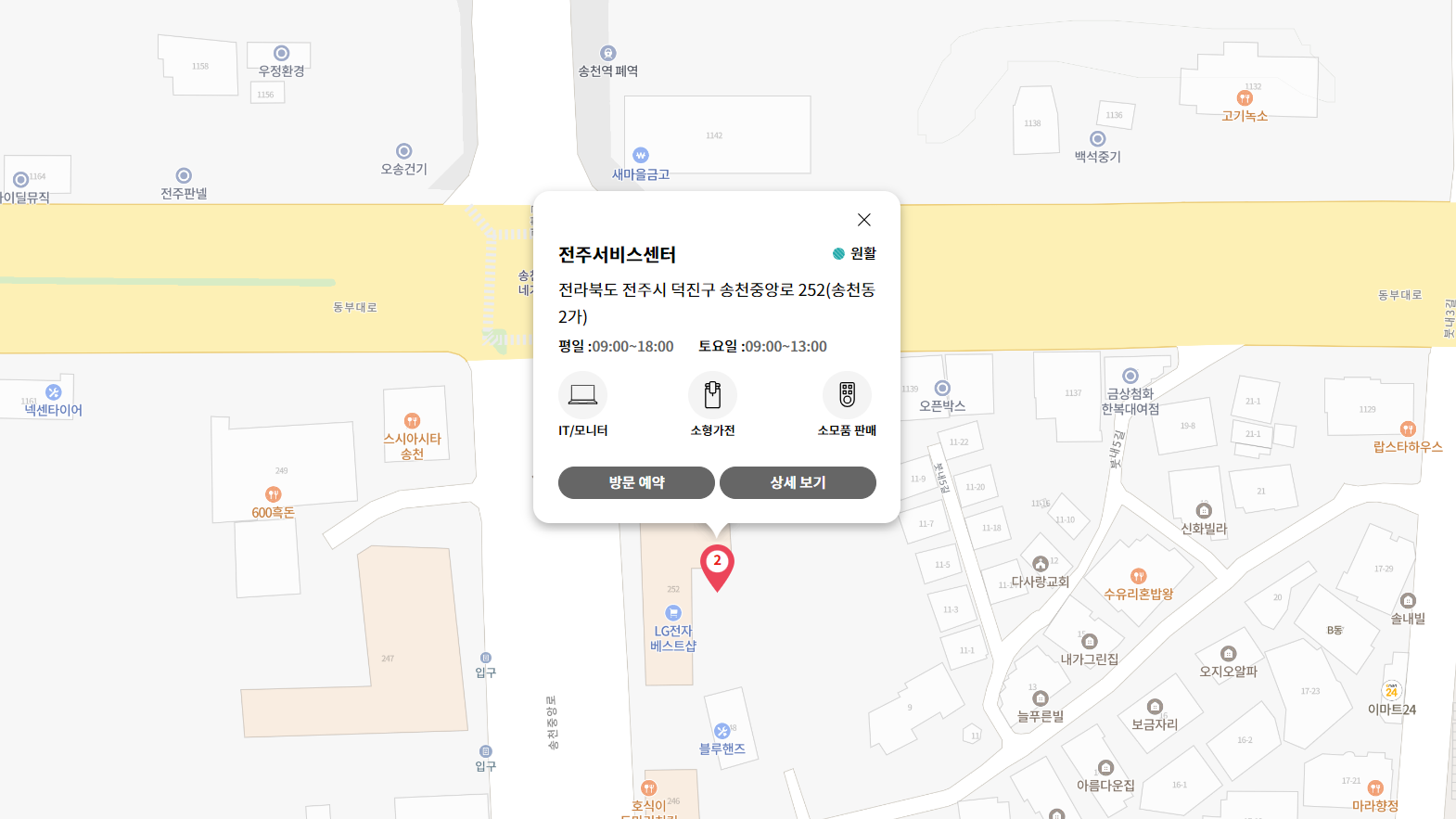 주소 전라북도 전주시 덕진구 송천중앙로 252 LG BEST SHOP 3층(지번:송천동2가 455)