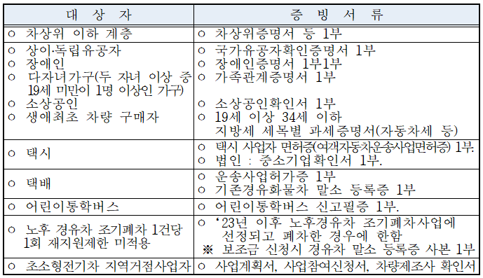 - 차량 출고 및 등록 후 10일 이내에 보조금 지급 신청
