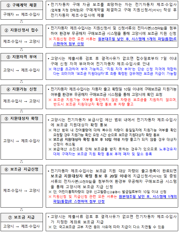 - 고양시는 구매 지원신청서 접수되면 신청자격 등 검토 후 자격부여하여 자동차 제작·수입사로 안내