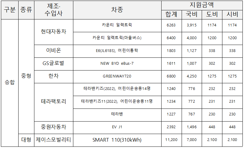 | 제조·수입사 | 차종 | 국고보조금 (만원) |