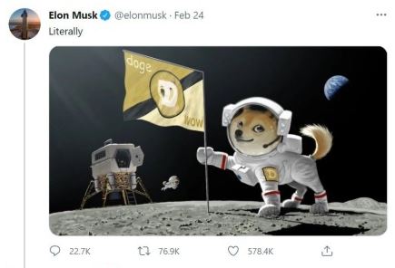 4월 1일 만우절 농담으로 "문자 그대로의 도지코인(DOGE)을 문자 그대로의 달 위에 놓을 것"