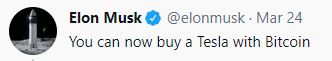 일론머스크는 2021년 3월 24일 트위터에 "테슬라를 살 때 비트코인(BTC)으로 구매할 수 있다"라는 트위터를 올려 화재가 됐다.