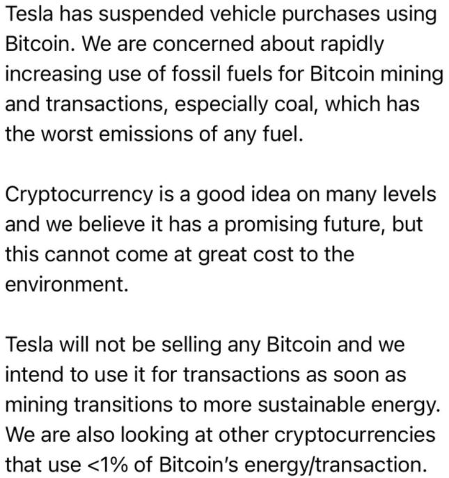 이유로는 "비트코인(BTC)을 채굴하기 위해 들어가는 석탄을 비롯한 화석연료의 사용의 사용이 증가하는 데에 크게 우려를 하고 있다"는 이유이다.