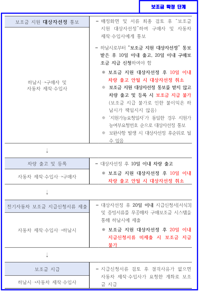 - 하남시는 예산 범위 내에서 자동차 제작·수입사에 보조금 지원 대상자 선정하여 통보