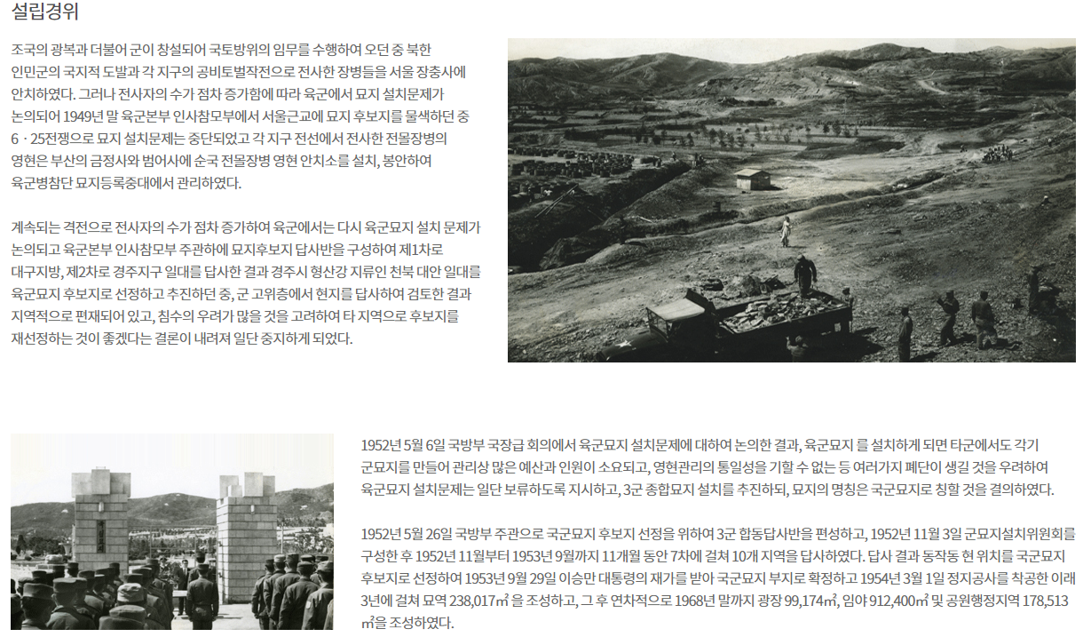 - 1954년 3월 1일 착공하였으며, 1955년 07월 15일에는 국군묘지관리소가 발족하고 1956년 04월 13일 대통령령으로 군묘지령이 제정되어 안장이 이루어지게 되었다.