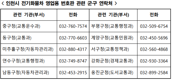 | 인천시 | 전기차 구매보조금 집행관련 업무 - 인천시 보조금 지원 자격, 지방보조금 등 책정 - 전기자동차 구매보조금 대상자 선정 등 - 인천시 전기화물차 영업용 번호판 관련 |
