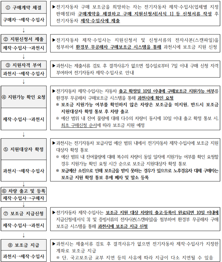 - 과천시는 구매 지원신청서 접수되면 신청자격 등 검토 후 자격부여하여 자동차 제작·수입사로 안내