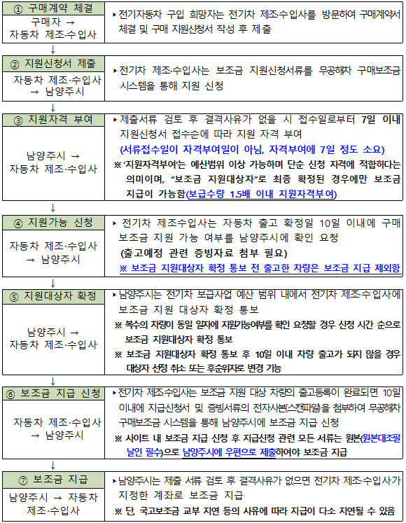 - 남양주시는 구매 지원신청서 접수되면 신청자격 등 검토 후 자격부여하여 자동차 제작·수입사로 안내