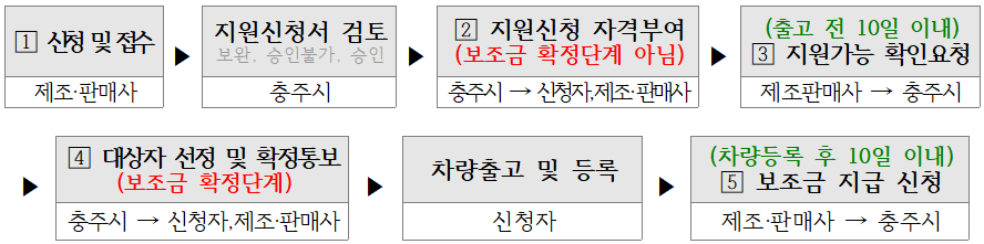 - 충주시는 예산 범위 내에서 자동차 제작·수입사에 보조금 지원 대상자 선정하여 통보