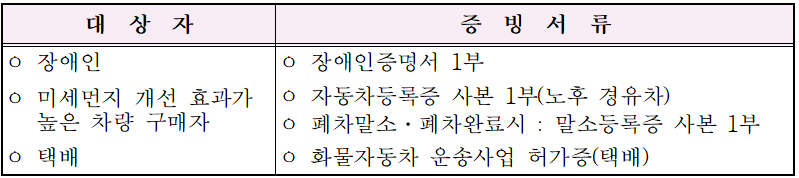 - 전기화물차 : 기존 노후 경유 차를 조기 폐차 한 경우 폐차 1건 당 1회 재지원 제한 기간 미적용