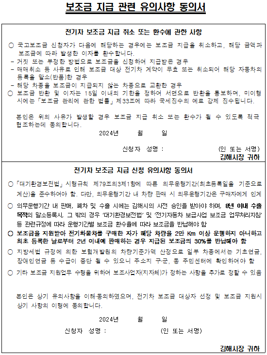 - "전기차 보조금 지급 취소 또는 환수" 및 "보조금 지급 신청 유의사항" 동의