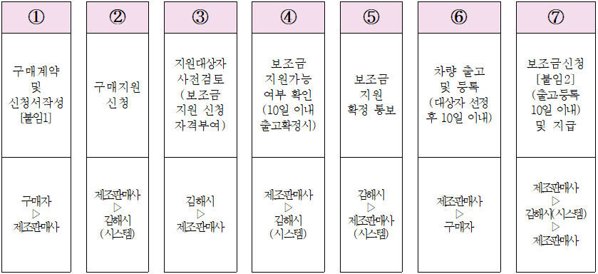 - 김해시 구매 지원신청서 접수되면 신청자격 등 검토 후 자격부여하여 자동차 제작·수입사로 안내