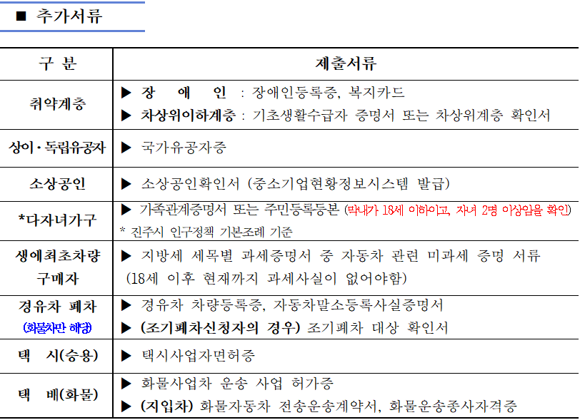 - 진주시는 구매 지원신청서 접수되면 신청자격 등 검토 후 자격부여하여 자동차 제작·수입사로 안내