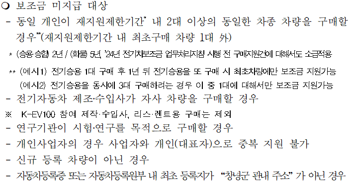 - 노후 경유차를 조기폐차한 경우 폐차 1건 당 1회 재지원제한기간 미적용('24년 전기자동차 업무처리지침 시행 이후 폐차 건부터 적용)
