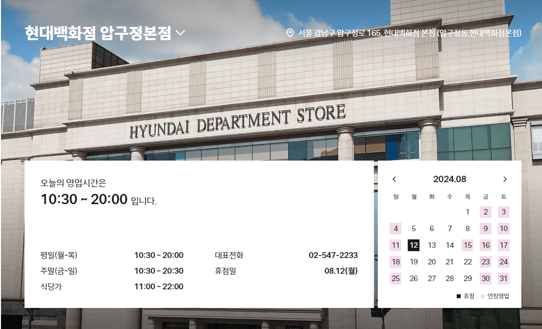 현대백화점 압구정본점 고객센터 전화번호, 영업시간, 주차요금, 무료주차시간, 휴무일, 층별매장 위치 등 다양한 정보에 대해 알아보겠습니다.
