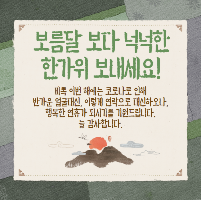 - 올 한 해도 고객님께서 보내주신 사랑에 감사드리며, 행복하고 넉넉한 추석 보내시길 바랍니다.