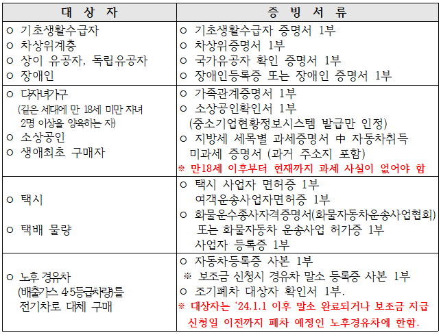 ※ 전기승용(중·대형, 소형)은 리스/렌탈 사업목적으로 구매(증빙서류 제출 필요)하는 경우 국비 180만원 이내 추가 지원