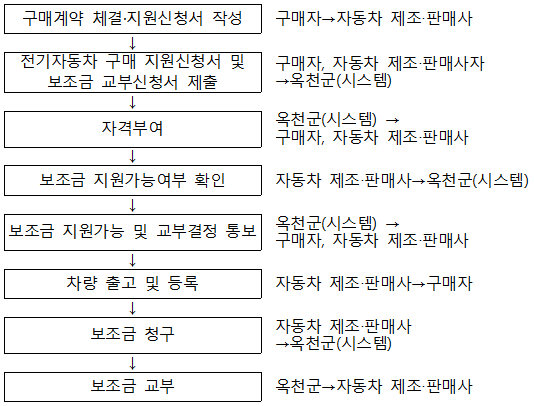 - 옥천군은 예산 범위 내에서 자동차 제작·수입사에 보조금 지원 대상자 선정하여 통보