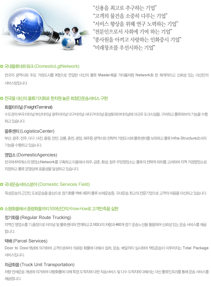 대신택배는 총 1,800여 대의 노선 및 택배 차량, 800여 곳의 영업소, 20여 개 소의 화물터미널과 물류센터의 운송망을 가지고 있으며, 전국의 광역시와 주요 거점도시를 X자형으로 연결한 운송서비스를 제공중입니다.