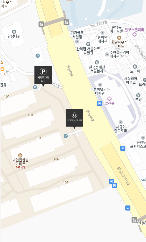 - 차량 이용시 한남타워 정문 앞에서 GOURMET494 HANNAM 지하주차장으로 진입 가능