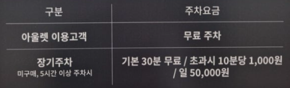 - 장기주차(5시간 이상 주차)시 기본 30분 무료 초과 10분당 1,000원
