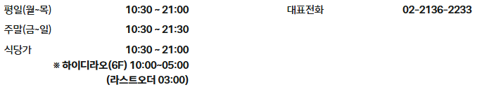 주말(금-일) 영업시간 10:30 ~ 21:30