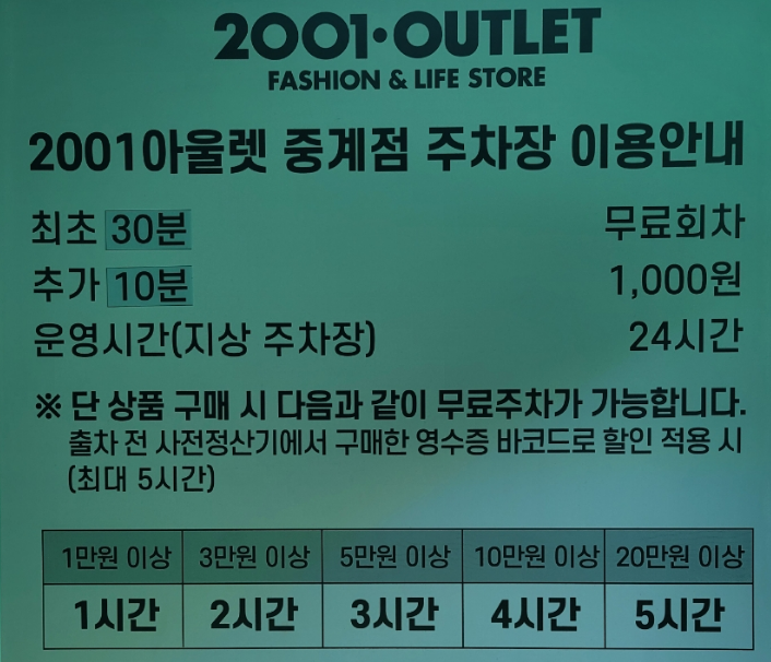2001 아울렛 중계점 구매 금액별 무료주차 시간