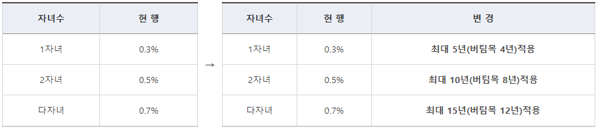 - 1자녀 0.3%p, 2자녀 0.5%p, 3자녀 0.7p% 적용