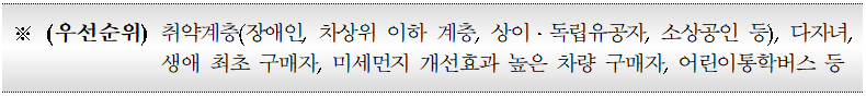 ※ 전기승용은 차상위 이하 계층 국비 지원액의 20% 추가 지원(청년 생애 최초 10% 추가 지원)