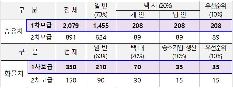 - 승용차(일반, 택시, 우선순위 배정 물량) 잔여분 7월 1일부터 통합 진행
