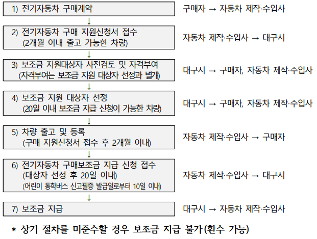 - 대구시는 제출된 서류 검토 후 결격사유 없을 경우 자동차 제작·수입사가 지정한 계좌로 보조금 지급