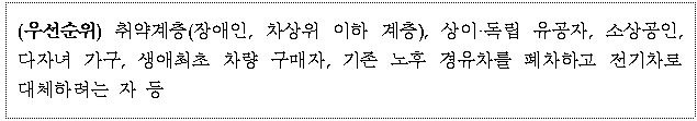※ 전기승용은 차상위 이하 계층 국비 지원액의 20% 추가 지원(청년 생애 최초 10% 추가 지원)