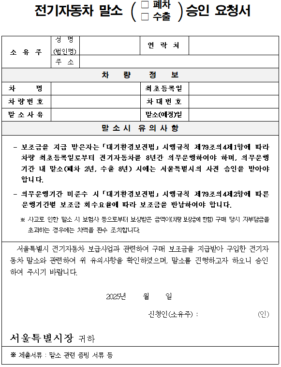 | 기존 노후 승용전기차 폐차 | - 자동차 말소 증명서 1부 |