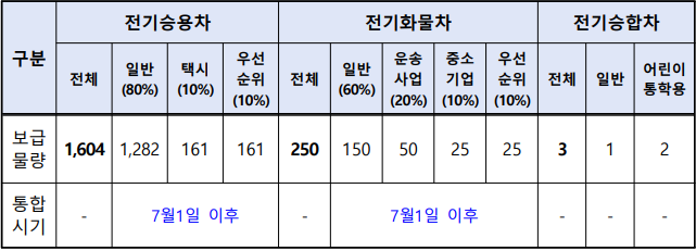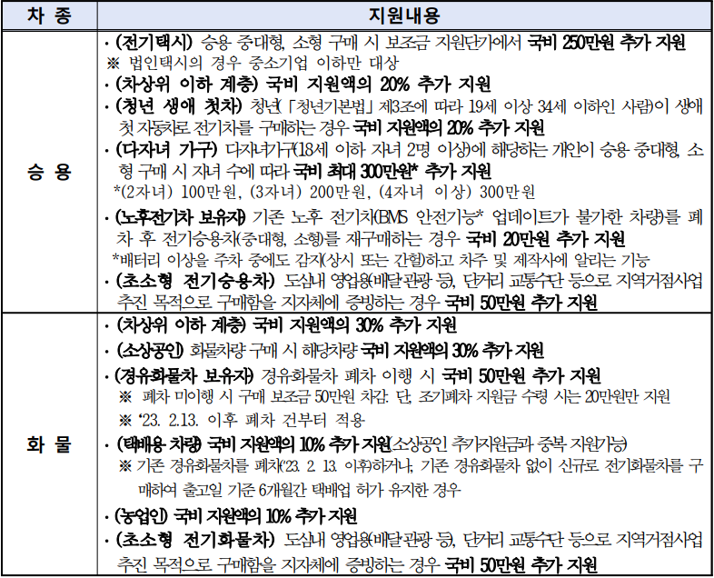- (우선순위) 취약계층(장애인, 차상위이하 계층), 상이·독립유공자, 다자녀, 소상공인, 농업인, 노후경유차를 조기폐차하고 전기차로 구매하는 자, 생애최초 차량 구매자