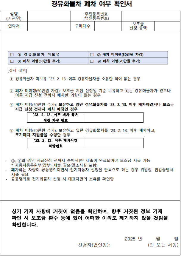| 노후 경유차 조기폐차 1건당 1회 재지원제한 미적용 | - 23년 이후 노후경유차 조기폐차사업에 선정되고 폐차한 경우에 한함 ※보조금 신청시 경유차 말소 등록증 사본 1부 |