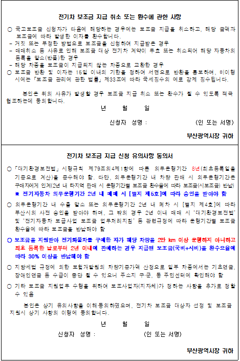(별지 1호 서식) 전기차 보조금 지급 취소 또는 환수 및 지급 신청 유의사항 동의서 1부.
