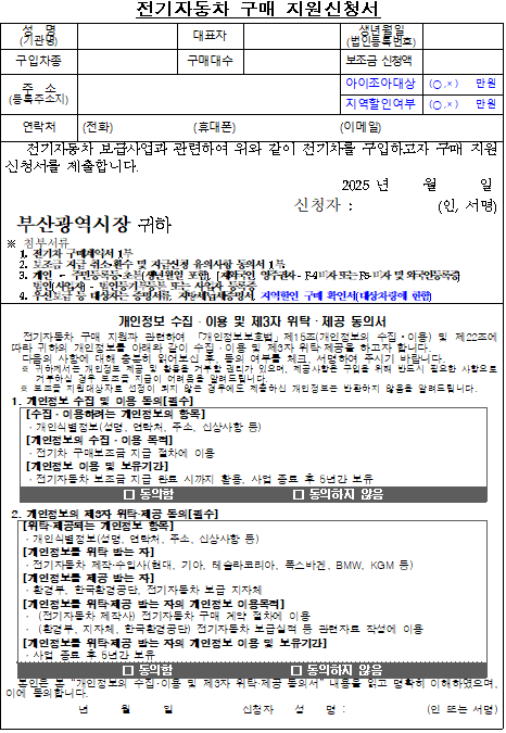 (별지 1호 서식) 2025년 전기자동차 구매 지원신청서 및 개인정보 동의서 1부.