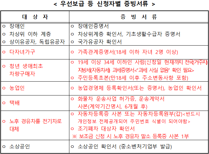 <우선지원, 추가보조금 등 대상자별 증빙서류>