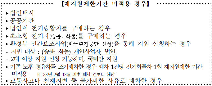 | 노후 경유차 조기폐차 1건당 1회 재지원제한 미적용 | - 23년 이후 노후경유차 조기폐차사업에 선정되고 폐차한 경우에 한함 ※보조금 신청시 경유차 말소 등록증 사본 1부 |