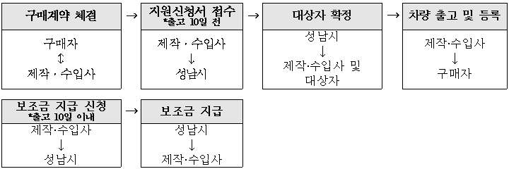 | 성남시 기후에너지과 | 전기차 구매 보조금 지원 업무 - 지원 신청 및 자격 부여 - 대상자 선정 및 보조금 지급 |