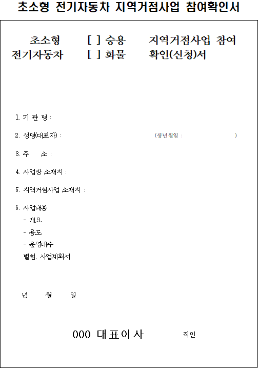 - (공통) 전기승용차 구매 지원신청서(별지1호), 동의서(별지2호) 차량구매계약서(출고예정일, 계약번호 명시), 출고증빙자료(배정화면 등)